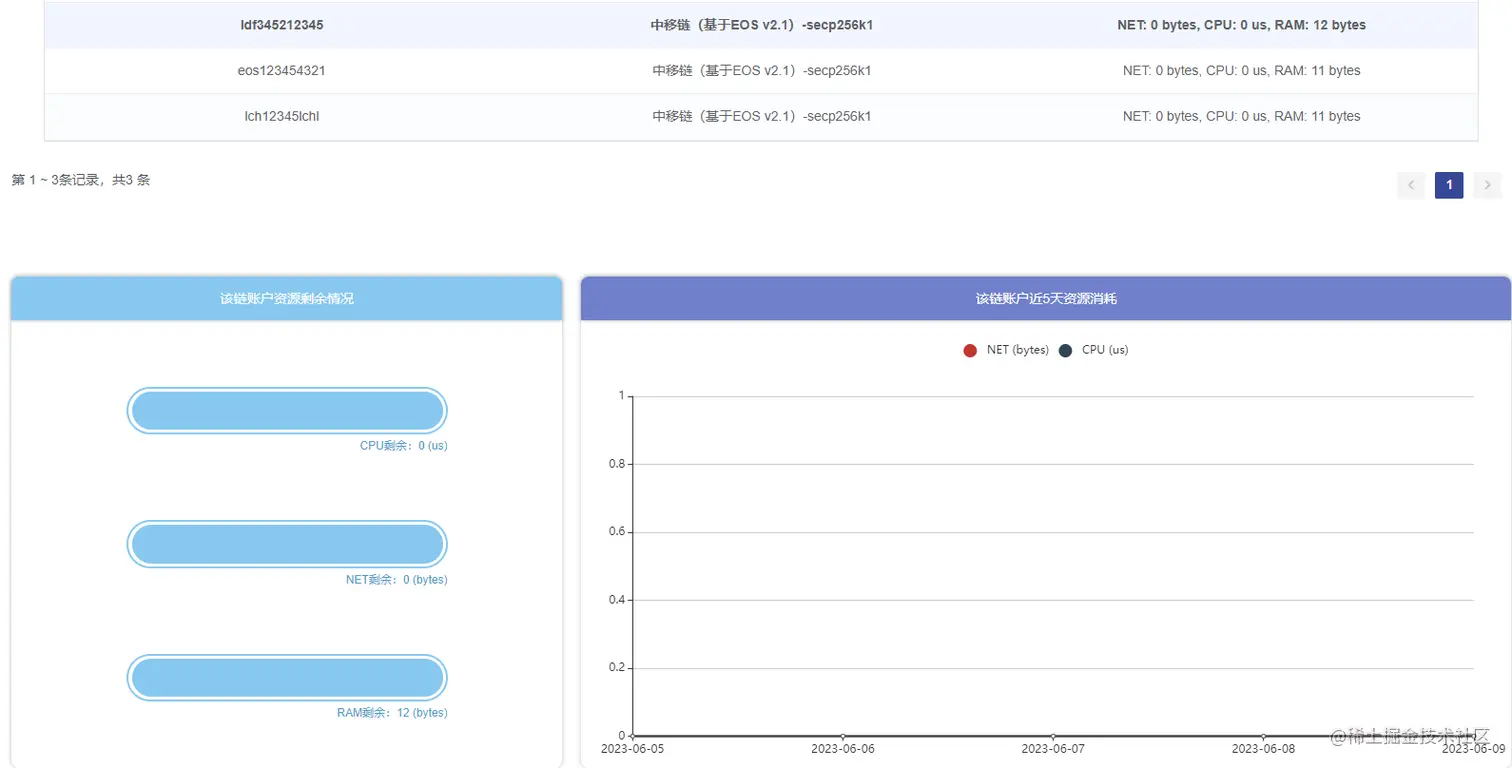 从接口返回信息可以看到,每个链账户都可以获得一定的CPU、NET和RAM资源。用户可以在中移链开放联盟链中通过分配资源功能购买资源。