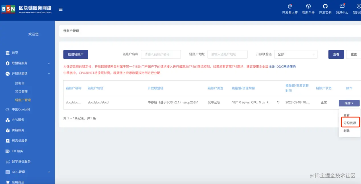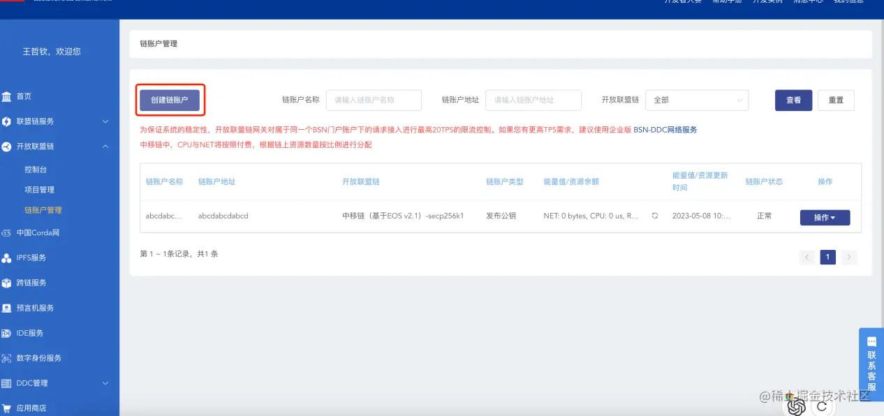 确认公私钥对并妥善保存后,在BSN开放联盟链后台中找到链账户管理,点击左上角的创建链账户。