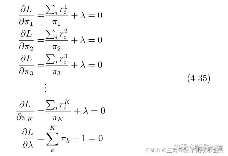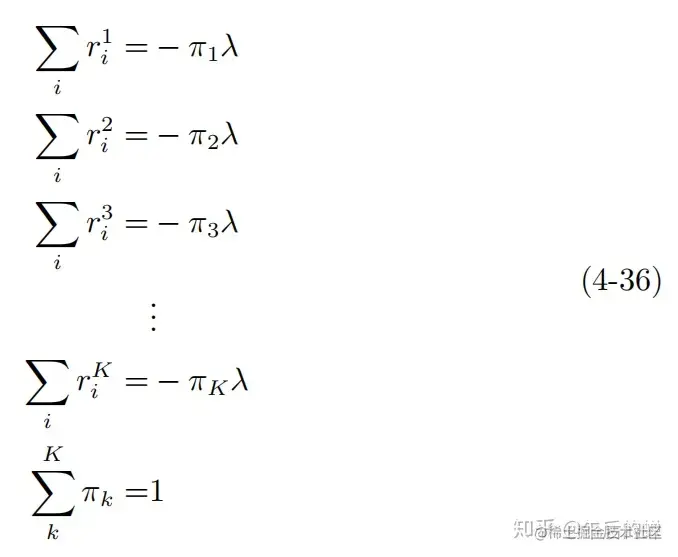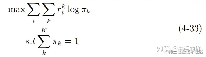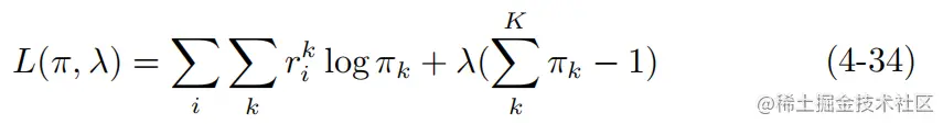 求参数 π 通过式 4-31 可以看到参数 π 和参数 µ, Σ 相互独立,所以我们可以分别求解。由式 4-30,我们可以将 转化下面这个优化问题的解:
