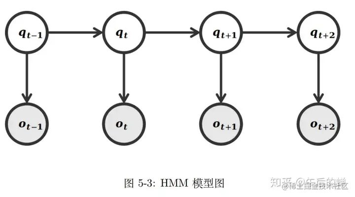 首先我们来回顾下 HMM 的基本概念。HMM 的模型如图 5-3 所示。HMM 是关于随机变量 {O1, O2, O3, ..., OT , Q1, Q2, Q3, ..., QT } 的联合概率密度模型。其中 Qt 表示隐变量,它是离散型数值。Ot 是观测变量,它既可以是离散的数值也可以是连续的数值。HMM 引入 2 个假设,使问题变得简化,容易求解: