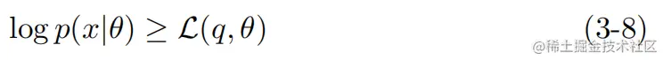 式 3-6 中红色的部分有一个专有名字 ELBO(Evidence lower bound), 即:
