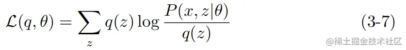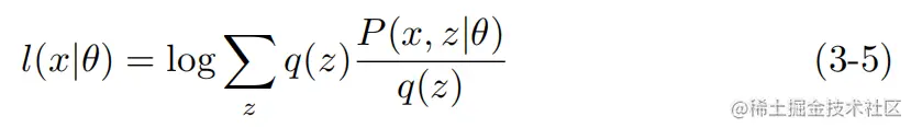 现在,我们假设存在一个关于隐变量 z 的概率质量分布 q(z)(如果是 z 是连续变量,则是概率密度函数), 我们在式 3-4 中同时乘一个 q(z) 和除一个 q(z),不改变结果: