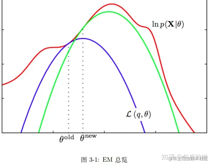 图 3-1 经常出现在 EM 相关文档中,我们也借助图 3-1 来说明下 EM 过程。图中,横坐标是 θ 值,纵坐标是对数似然值。