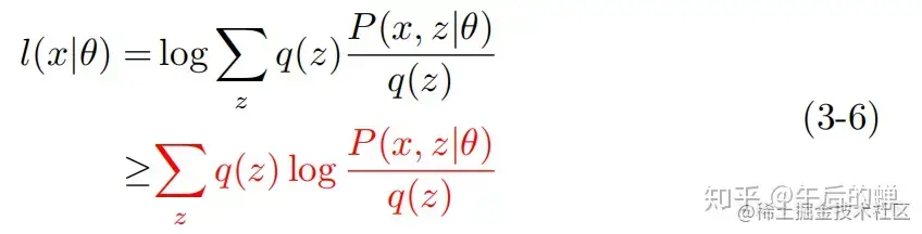 在式 3-5 中 log 后面的部分可以看做是变量 关于分布 q(z) 的期望。这时,可以借用 Jenson’s inequality 在凹函数下形式"期望的函数大于等于函数的期望",便可以将 log 放到 ∑ 内部: