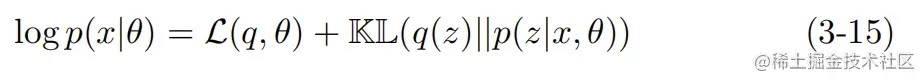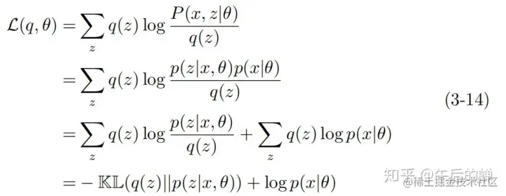 式 3-14 的推导过程相比式 3-22, 不仅可以求出 q(z), 而且还可以得到 ELBO 与 p(x|θ) 的定量关系 (如式 3-15 所示)。后面我们以 的表达形式说明。