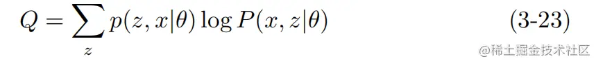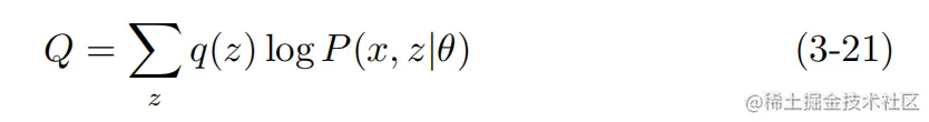 式 3-20 是求解参数 θ 的过程,而且在求解过程中,必须求解“完全可观测”数据的 log-likelihood,这个过程叫做学习过程。其中我们将式 3-20 中的最大化项定义为 Q 函数, 即: