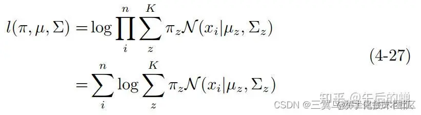 可以看到 GMM 的 log-likelihood 式 4-27 化简出 log − sum 的形式,不方便直接计算。