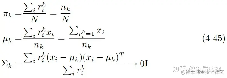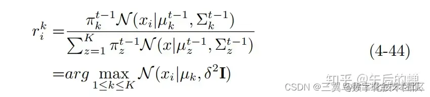 退化为第 k 个高斯分布中点的均值 (重心)。这时 EM 算法中的 E 步,即式 4-44 中