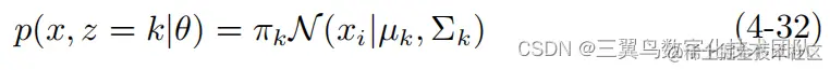 因为数据集 D 中,任意 2 条数据相互独立,他们在求 log-likelihood 时没有耦合,所以对他们的“对数似然的和求期望”,等价于“分别求期望后的和”,于是第一行的 可以提到最左侧。对于 GMM 模型,当知道完全数据 (x, z)时,完全数据的概率: