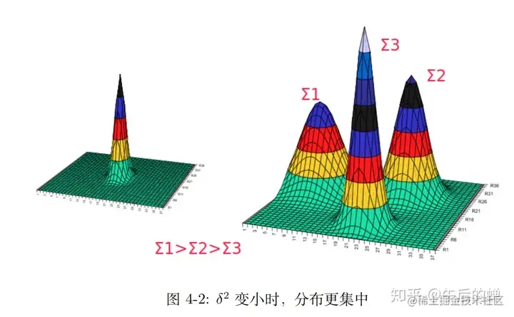 → 0,直观上每个高斯分布的概率质量更集中, 如图 4-2。当