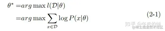 θ* 表示最优的参数,l(D|θ) 表示数据集 D 的对数似然函数。实际求解时会对式 2-1 取负号变为 NLL(negative log likelihood), 从而将最大化转化为最小化的问题, 然后采用基梯度 (gradient-based) 的优化方法,求解出式 2-1 的一个局部极小点。这里为了叙述方便,我们以 MLE 的原始形式说明。