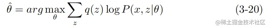 式 3-19 是在 θ, x 已知的条件下,对隐变量的推断,这是推断过程。同理当已知 q(z), 在 M 步我们求得: