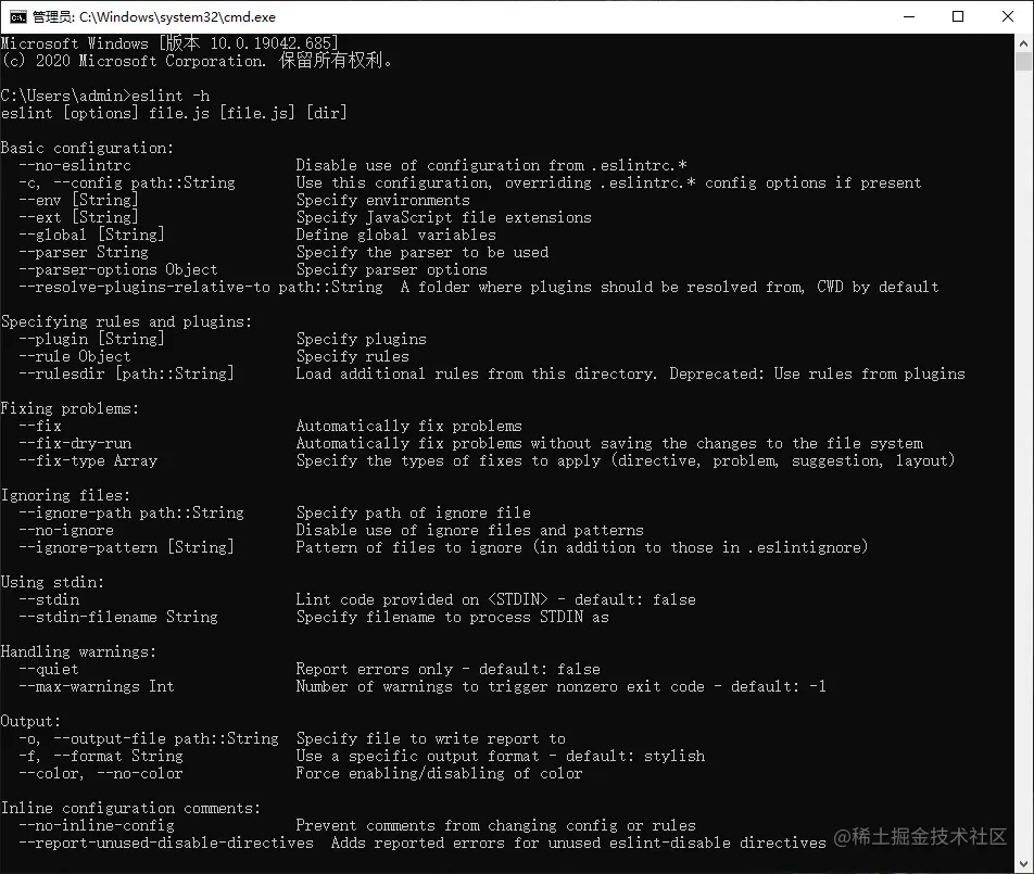 在命令行中输入eslint -h能够显示出ESLint命令的所有配置项。