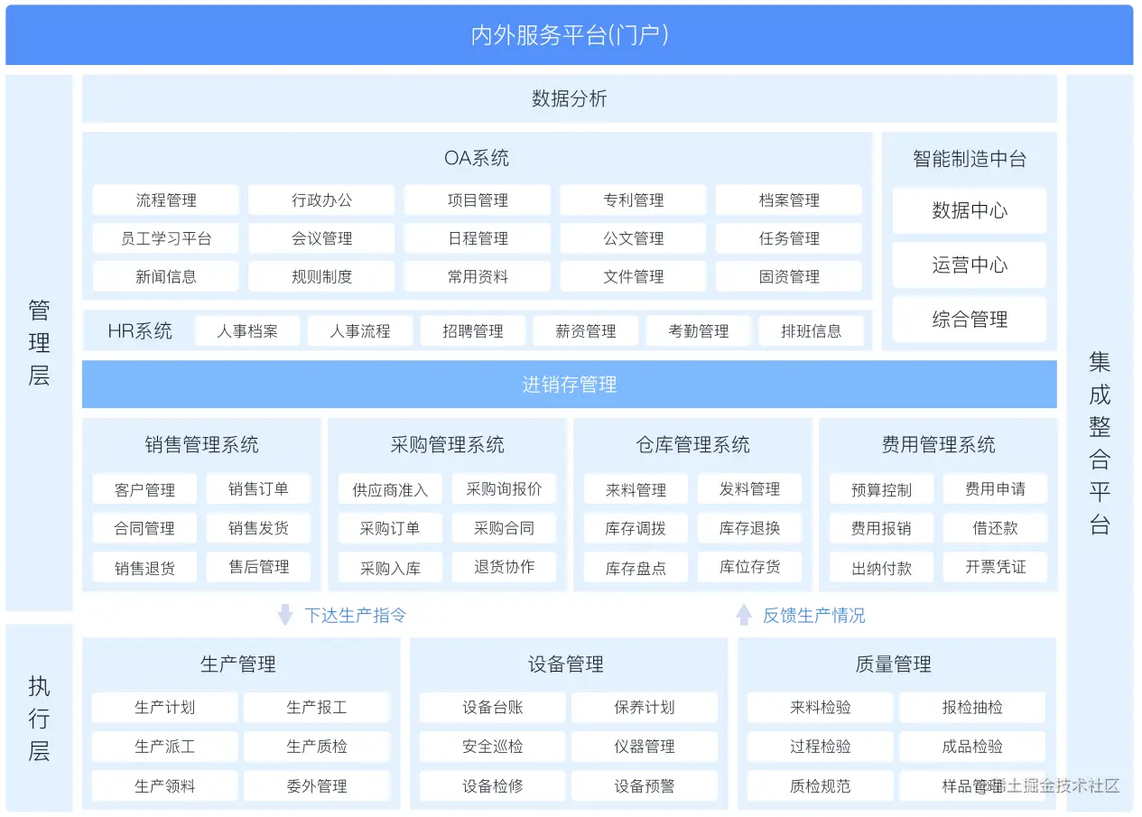 通过JNPF平台,可以有效打通企业管理层、运营层、执行层的信息壁垒,采用管控一体化的方式,上到数据决策、工厂管理,下到销售、采购、生产、仓库、供应商等核心管理内容进行串联,有效帮助生产制造企业降本提效、保障产品质量。