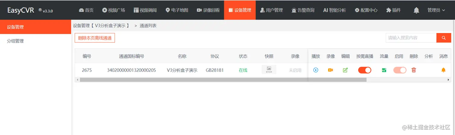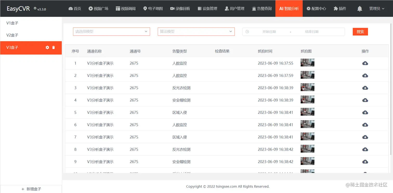 5)配置完成后,在EasyCVR平台上即可看到V3盒子分析的结果。