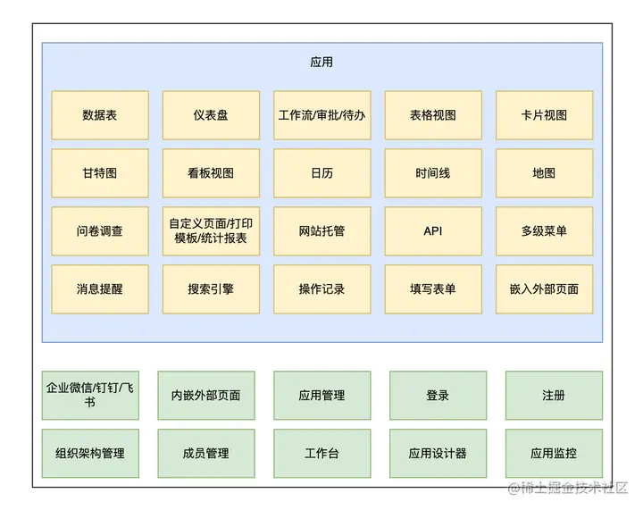 7、开放生态能力:基于java低代码开发平台的开发标准,可开发插件化的应用产品,上架到工作台。所有使用低代码平台开发的产品都可以方便地整合应用插件。每个开发人员都可以按照开发平台的标准创建应用,发布应用到工作台。