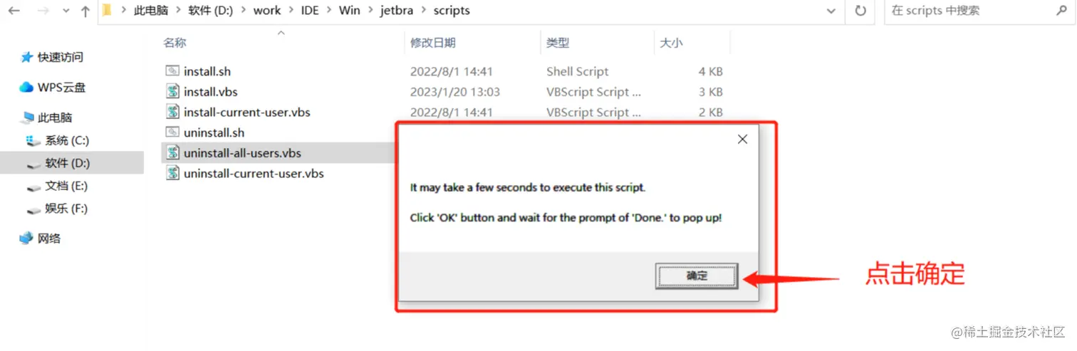 - 先执行unistall-current-user.vbs,直接双击打开,此步骤是为了防止之前有过激活信息,确保当前环境变量下没有激活工具的变量信息,可先执行卸载脚本在再进行后面的激活操作,避免激活失败。