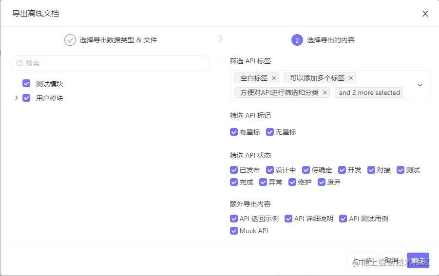 1、 如果是选择导出项目内所有API文档方式 则左侧栏显示筛选API分组 右侧栏显示选择筛选条件 如图