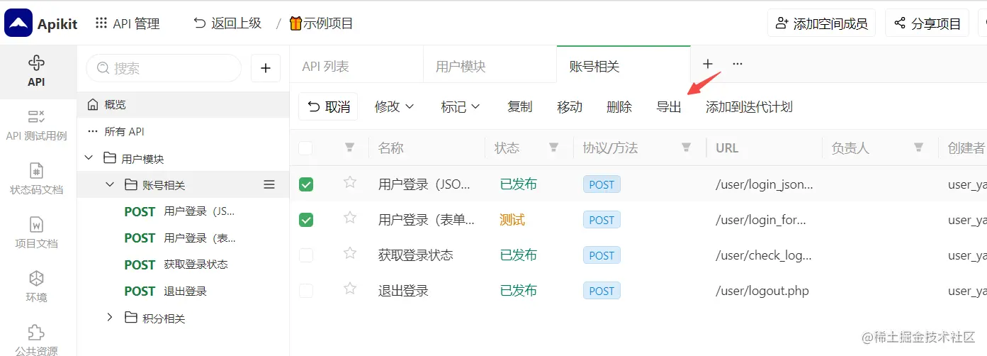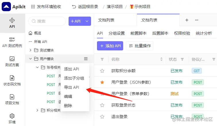 1、在左侧栏的API点击,选择需要导入的分组,点击下拉框选择导出API