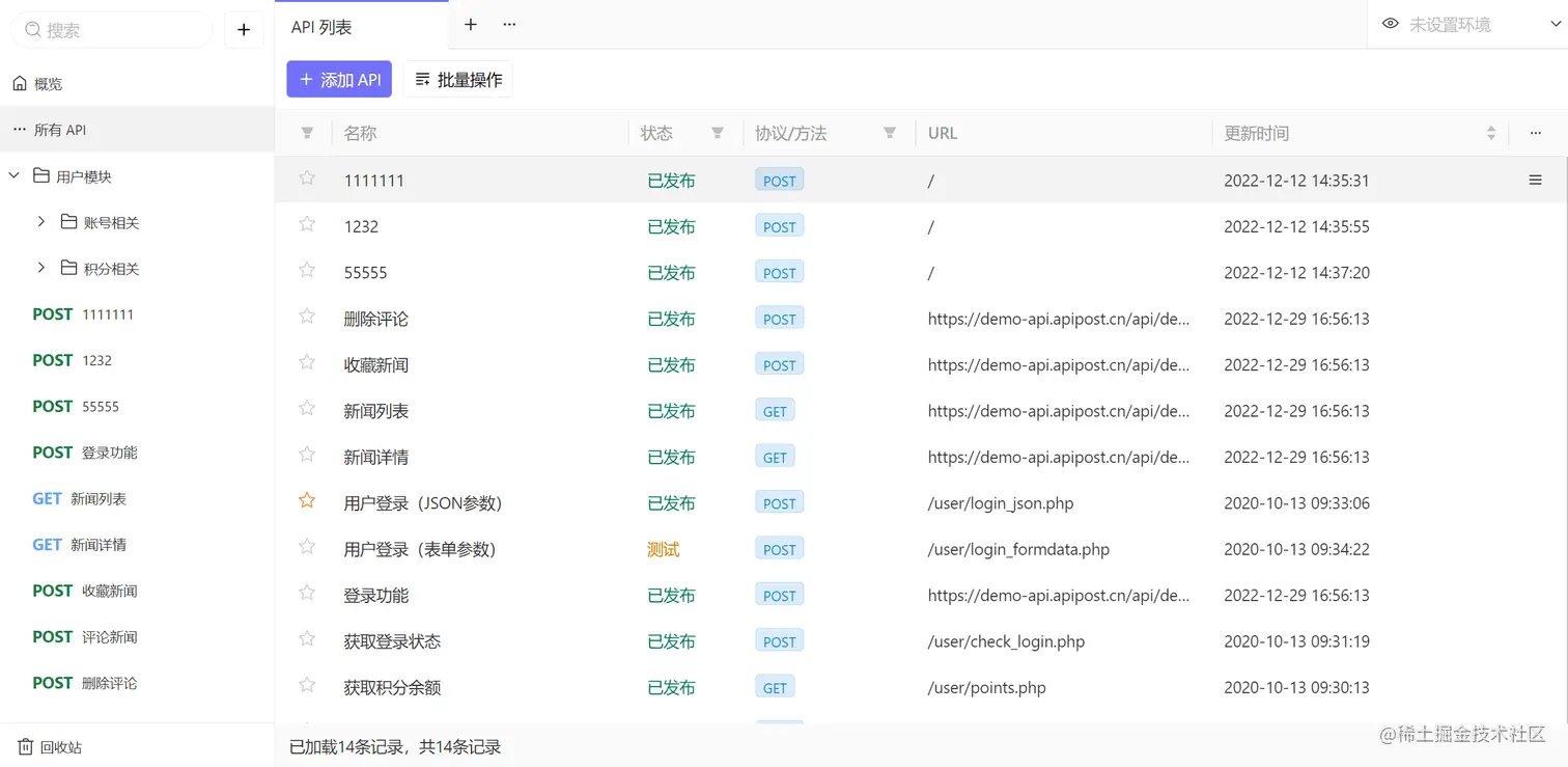 2)筛选API标记:可以筛选有星标和无星标的API数据