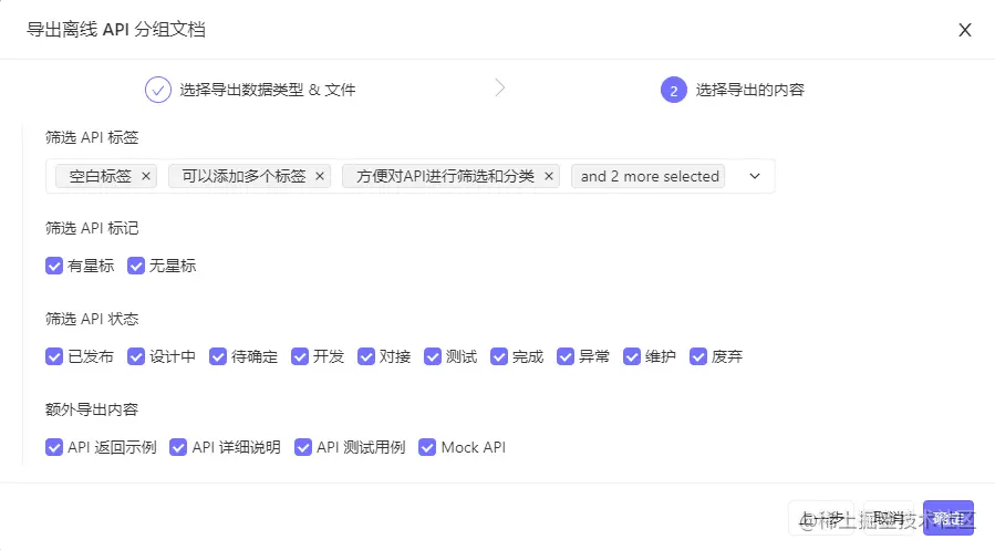 3、如果是导出指定的API文档,则显示筛选条件,并且只显示额外导出内容如图