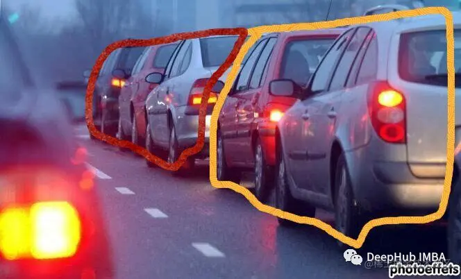 逐像素分类该方法指的是为图像中的每个像素分配一个类标签。在这种情况下,每个像素都被独立处理,模型根据该像素位置的输入特征预测该像素属于哪个类。对于边界清晰、定义明确的对象,逐像素分类可以非常准确。但是当感兴趣的对象具有复杂的形状,相互重叠或位于杂乱的背景中时,它可能会遇到困难,这可以解释为这些模型倾向于首先根据其空间边界来查看对象。考虑一幅描绘多辆重叠汽车的图像。传统的实例分割模型(如逐像素模型)可能难以应对如下所示的情况。如果汽车重叠,这些模型可能会为整个重叠的汽车创建一个单一的并且是合并后的掩码。可能会把这个场景误认为是一辆形状奇怪的大型汽车,而不是多辆不同的汽车。