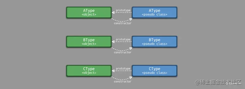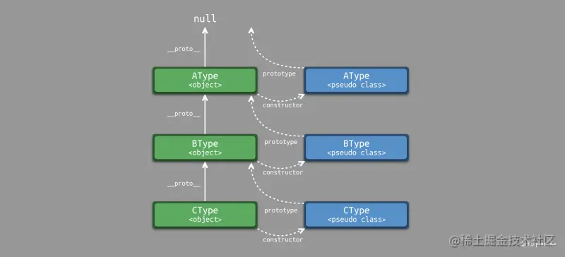其中 BType.prototype = new AType() 修改了 BType 伪类的 prototype 指针,使其指向 AType 对象。当我们调用 BType 构造函数时,所构造的对象自动继承 AType 对象。如下所示,为基于原型的继承关系示意图,其中每个伪类的 prototype 指针都发生了变化,指向了其所继承的父对象。最终,生成的对象中会包含一个 __proto__ 指针指向父对象。根据 __proto__ 指针我们可以构建一个完整的原型链。