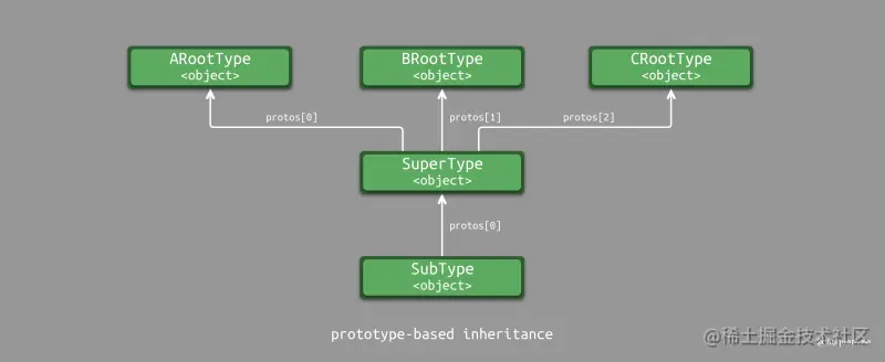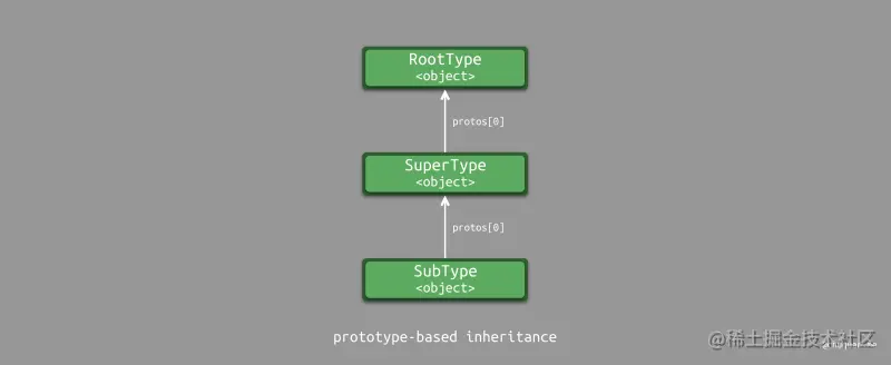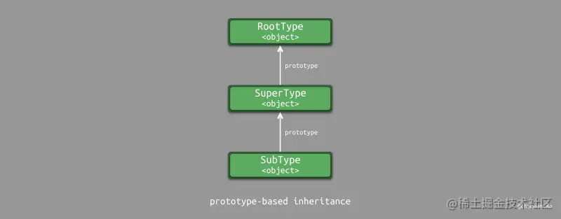 下图所示,为基于原型的继承实现示意图。每个对象都有一个类似 prototype 的指针指向其原型对象。