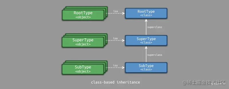 下图所示,为基于类的继承实现示意图。每个类都有一个类似 superclass 的指针指向其父类。每个对象都有一个类似 isa 的指针指向其所属的类。