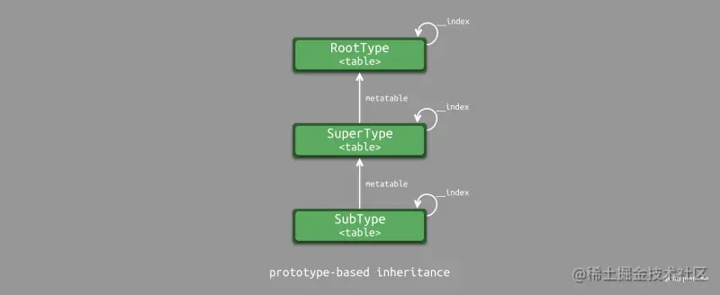 最终形成图中所示的对象继承关系。由于 Lua 中的继承实现没有类的概念,而只有对象的概念。因此也被归类成基于原型的继承模式。当 SubType 对象中没有找到对应的键时,会根据 metatable 指针找到对应的元表,并根据元表的 __index 指针找到进一步查找的表对象 SuperType。如果 SuperType 中仍然没有,那么继续根据 metatable 和 __index 指针进行查找。