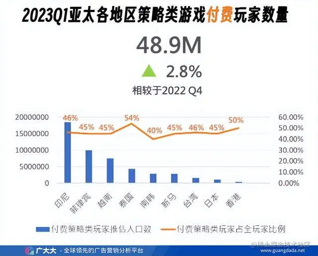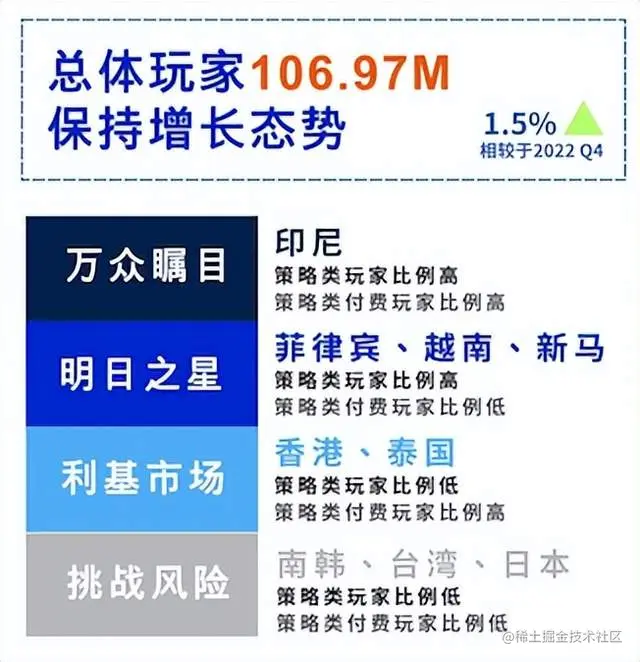 同比2022年Q4,付费型策略玩家的增长幅度以越南达4%最多,泰国3%位居第二,这也显示了越南、泰国在策略类手游市场上具有一定的潜力和竞争力。