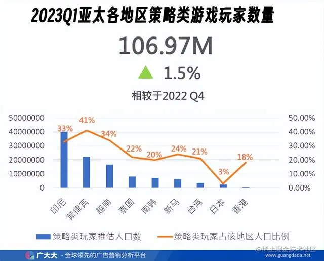 策略类游戏在移动游戏市场中备受关注,数据显示2023年Q1的越南、菲律宾、泰国均有2%的增长幅度,而策略类 游戏在日本影响力较低,仅占人口数3%。