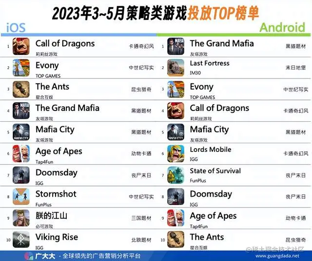 在策略(SLG)投放榜单中,几乎所有的产品都来自中国研发商。同时也因为策略类产品长运营、重买量的思路,使得该品类涌现出许多表现突出的优质创意。