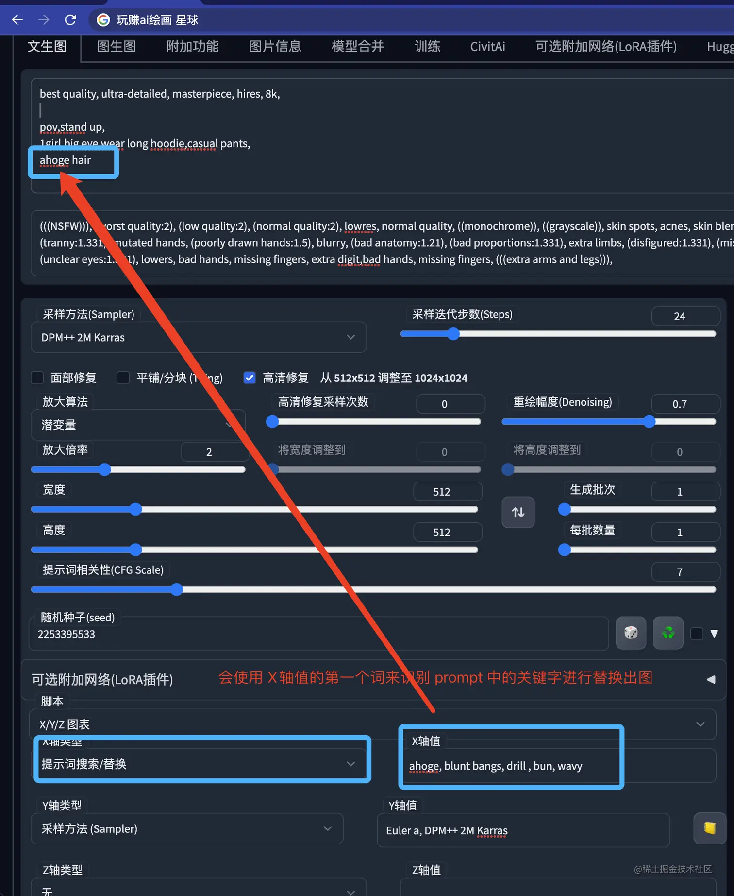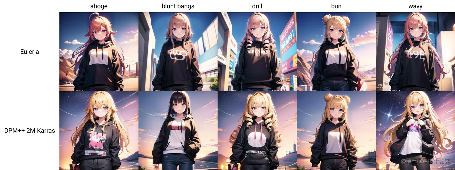 **举个例子:**我们希望比较不同的采样方法(Euler a, DPM++ 2M Karras)来渲染不同的发型(ahoge, blunt bangs, drill , bun, wavy),他们的效果是什么样的