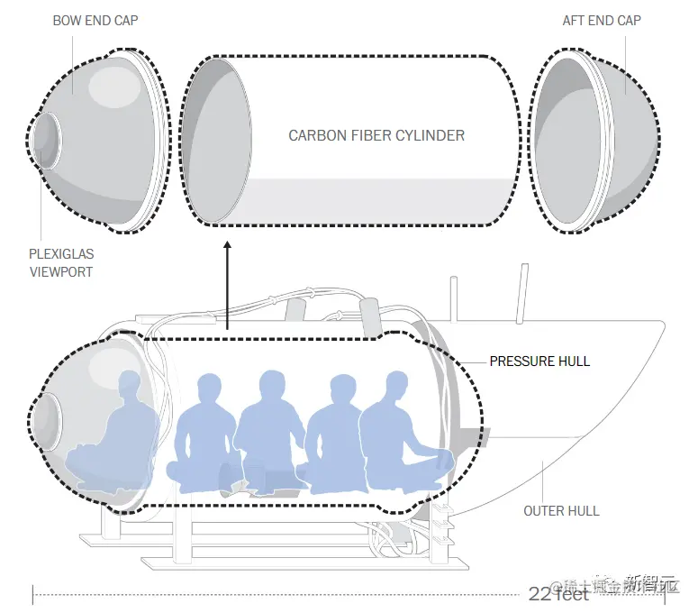 总结一下他们对于安全隐患的态度是:设计有隐患不怕,如果在4000米深海中检测到安全问题了,我们就跑(上浮)。除了船体材料的选择,潜水器的设计中也几乎没有考虑安全系统和安全相关的预案。这个是承担这次探索任务的潜水器「泰坦」的设计示意图。