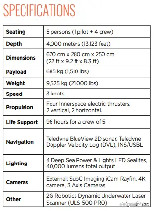在「海洋之门」的官方设计宣传中,他们给出了泰坦的其他细节参数:oceangate.com/pdf/oceanga… 9,525 公斤(21,000 磅),使用电动推进器可以以 3 节(3-1/2 英里/小时)的速度行驶。