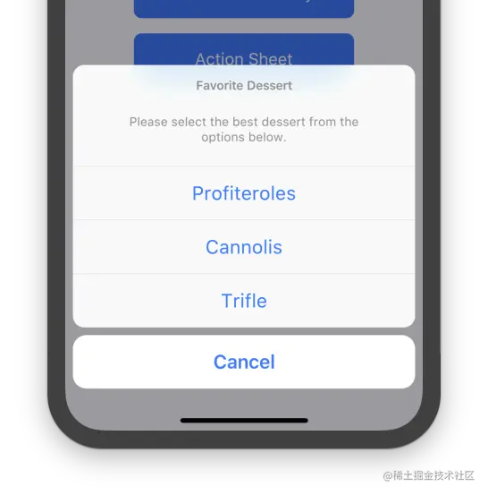 iOS 样式的模式弹框,对应 UIActionSheet(UIAlertController)。