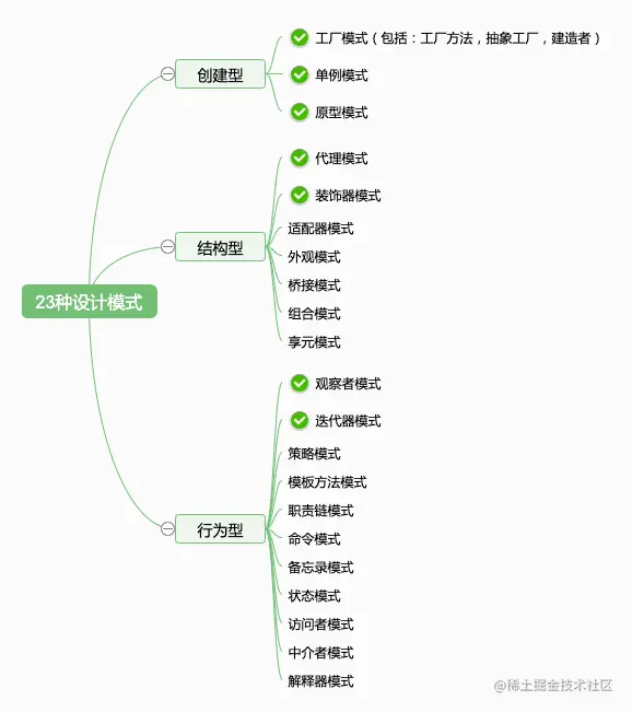 在学完前端基础的 HTML CSS JavaScript 以及框架 Vue React 之后,想更进一步时,学习了设计模式,以求得在工作中能能更好的方式实现需求,以及在后续学习开源库的源码时能够通过设计模式的思虑,了解开源工具的实现思路。介于本人学习上时间短,内容会有疏漏,如果错误,欢迎网友鞭策,会及时改进!