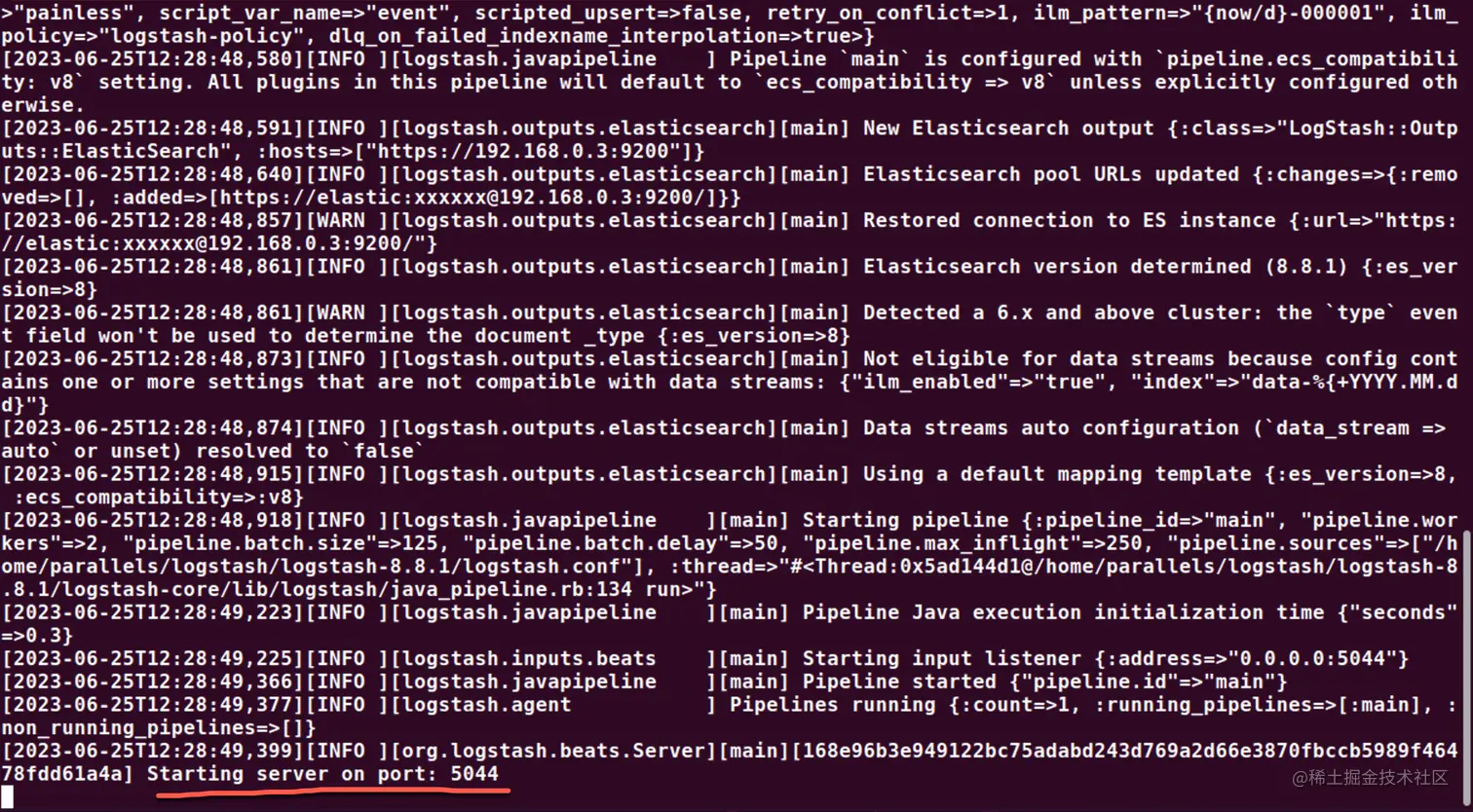 我们可以在 Logstash 运行的界面中看到如下的信息: