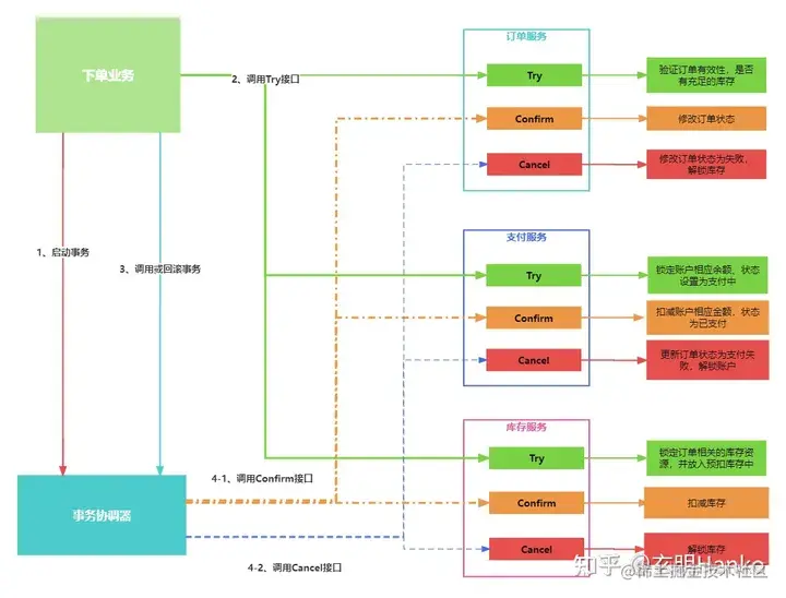 - Cancel阶段:在这个阶段,每个参与者取消执行业务操作,并释放预留资源,例如解锁库存、解冻账户余额等。这个阶段只有在Try或Confirm失败时才会触发。