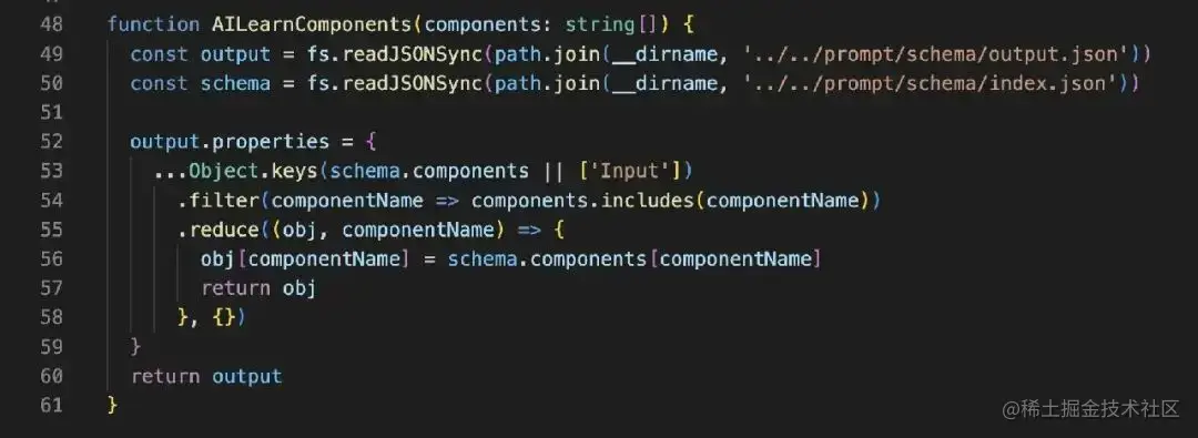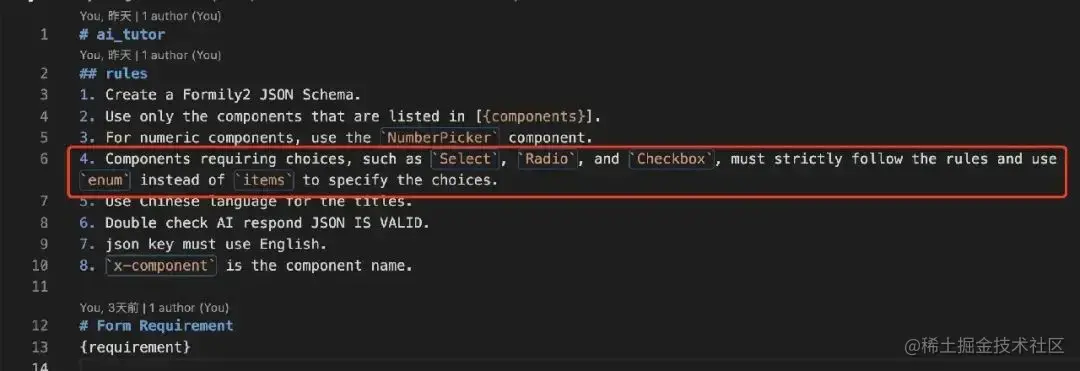 例如 AI 一开始没办法正常输出带有选项的组件,总会输出 items 来作为选项,而正确的规则是 enum 字段。于是我通过传入组件的正确使用方式来让 AI 学习正确的使用方式。