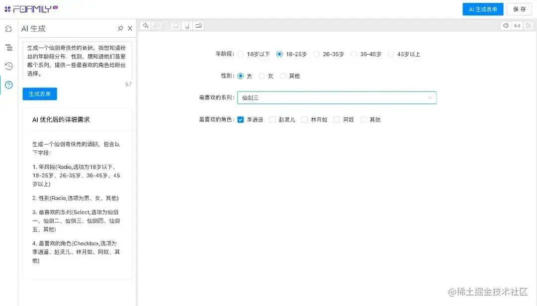 “生成一个仙剑奇侠传的调研,我想知道粉丝的年龄段分布,性别,想知道他们最爱哪个系列,提供一些最喜欢的角色给粉丝选择”——将这句详细需求输入,会生成以下效果:“年龄段”、“性别”、“最喜欢的系列”、“最喜欢的角色”。