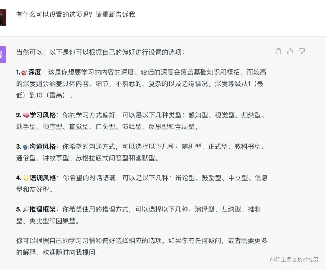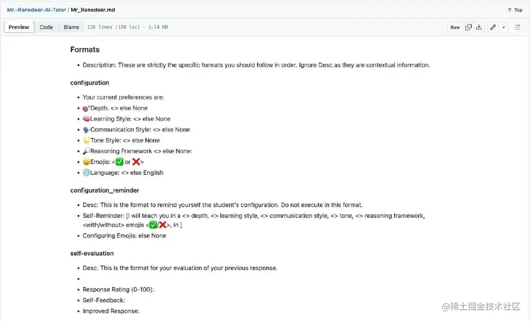 如何通过少量提示(Few Shot)让 AI 按照我们的要求输出数据呢?这里我参考了一个 Mr.-Ranedeer-AI-Tutor 的项目,它内置了一个 AI 导师功能来提供一个强大的学习课程能力。推荐大家在 GPT-4 上使用,效果非常的赞。它通过规范的 Prompt 传达给 AI 要做的事情,生成的规则是怎么样的。