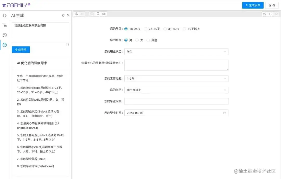 “我想生成互联网职业调研”——将这句需求输入,会生成以下效果,系统自动补充了详细需求如:“年龄”、“性别”、“职业状态”、“最关心的互联网领域”、“工作经验”、“学历”、“毕业院校”、“毕业时间”。