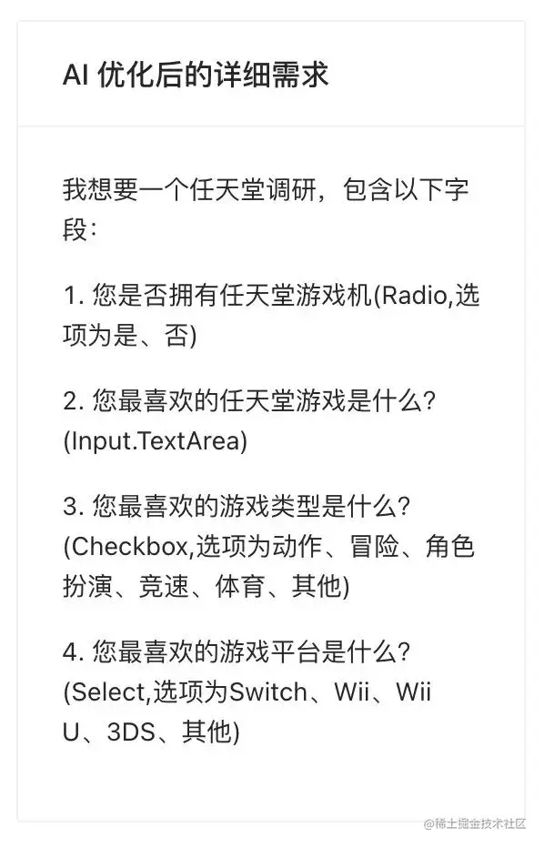 “我想要一个任天堂调研”——将这句需求输入,会生成以下效果,系统自动补充了详细需求如:“是否拥有任天堂游戏机”、“最喜欢的任天堂游戏”、“最喜欢的游戏类型”、“最喜欢的游戏平台”。