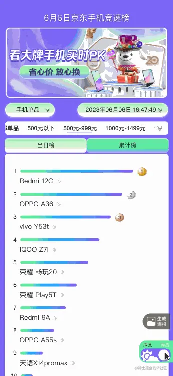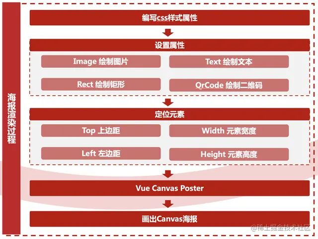 页面自动生成海报可以提高用户的互动性和分享性,增强品牌的曝光度和口碑效应,提高用户留存率和转化率。将网页的重要信息自动生成海报,并加上二维码方便竞速榜网页分享和传播。那么纯前端怎么画海报这块,就是一个关键的技术。竞速榜采用了通过 css 属性画 canvas 图片的轻量级的 vue 组件Vue Canvas Poster。它可以使用类css属性的方式,按照绝对定位布局生成canvas图。并且可以通过widthPixels设置生成图片尺寸,解决图片模糊问题。其中image属性用来绘制图片,text用来绘制文本,rect用来绘制矩形,qrcode用来绘制二维码。根据width 宽度、height高度、top上边距、left左边距,来组装对应元素位置,绘制海报内容。