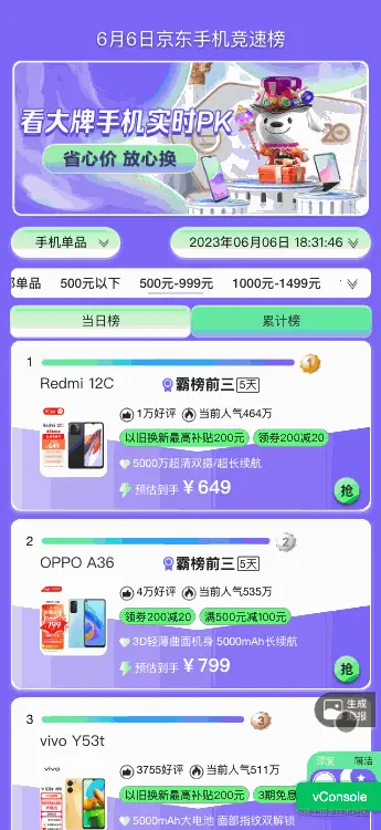竞速榜H5页面主要在京东APP以及微信中打开,如果发现报错等问题,无法在手机中调出开发者工具进行排查。vconsole是一个轻量级的前端调试工具,可以在移动端页面中方便地查看日志、调试代码、性能分析等,帮助开发者快速定位和解决问题,提高开发效率和质量。因此,加入vconsole可以方便地进行移动端页面的调试和优化,提高开发效率和用户体验。当URL中加入vconsole=1的参数时,会显示控制台,提效移动端排查效率。