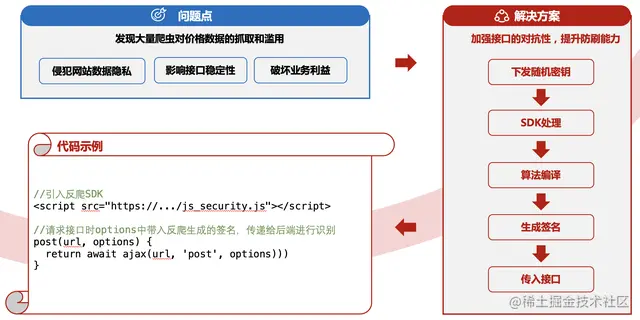 于是竞速榜网页价格信息接口添加网关和对应的SDK完成加密操作。主要通过后台下发的token和随机密钥算法,由前端将特定信息通过算法生成签名,传递给后端进行识别,可有效识别/拦截刷单刷券所产生的业务损失,加强接口的对抗性,提升防刷能力。