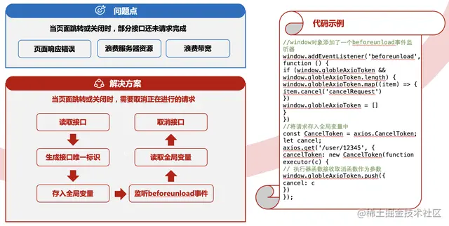 具体实现方案为读取接口时生成接口唯一标识,存入全局对象中。再在window对象添加了一个beforeunload事件监听器,当用户关闭或刷新页面时,会执行监听器中的回调函数。将之前存在全局变量window.globleAxioToken中的请求取消掉。