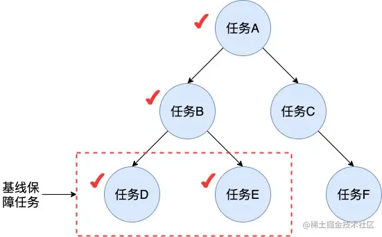 一般选择有SLA 要求的任务作为保障任务加入基线,DataLeap通过保障任务的依赖拓扑图自动监控上游任务,形成需要监控的任务链路。